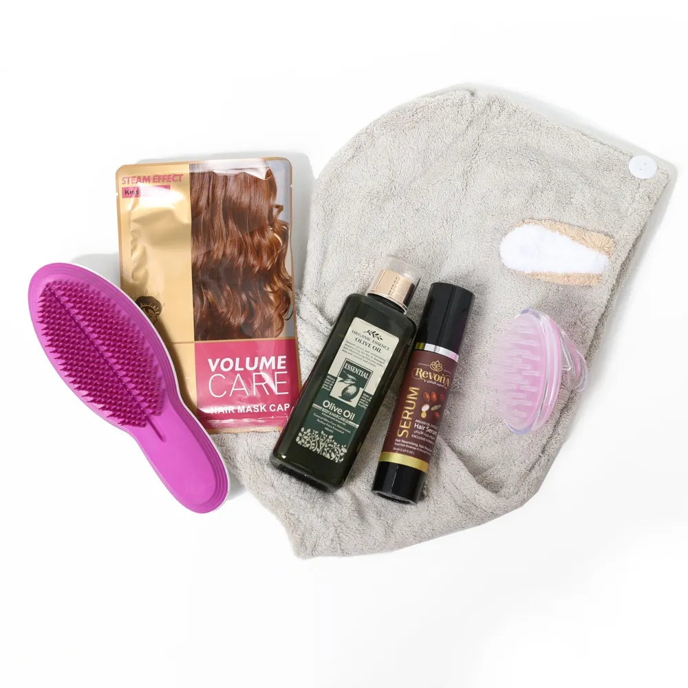 قبعة إستحمام،سيروم الشعر،عبوة زيت زيتون،فرشاة التدليك،مشط،ماسك للشعر