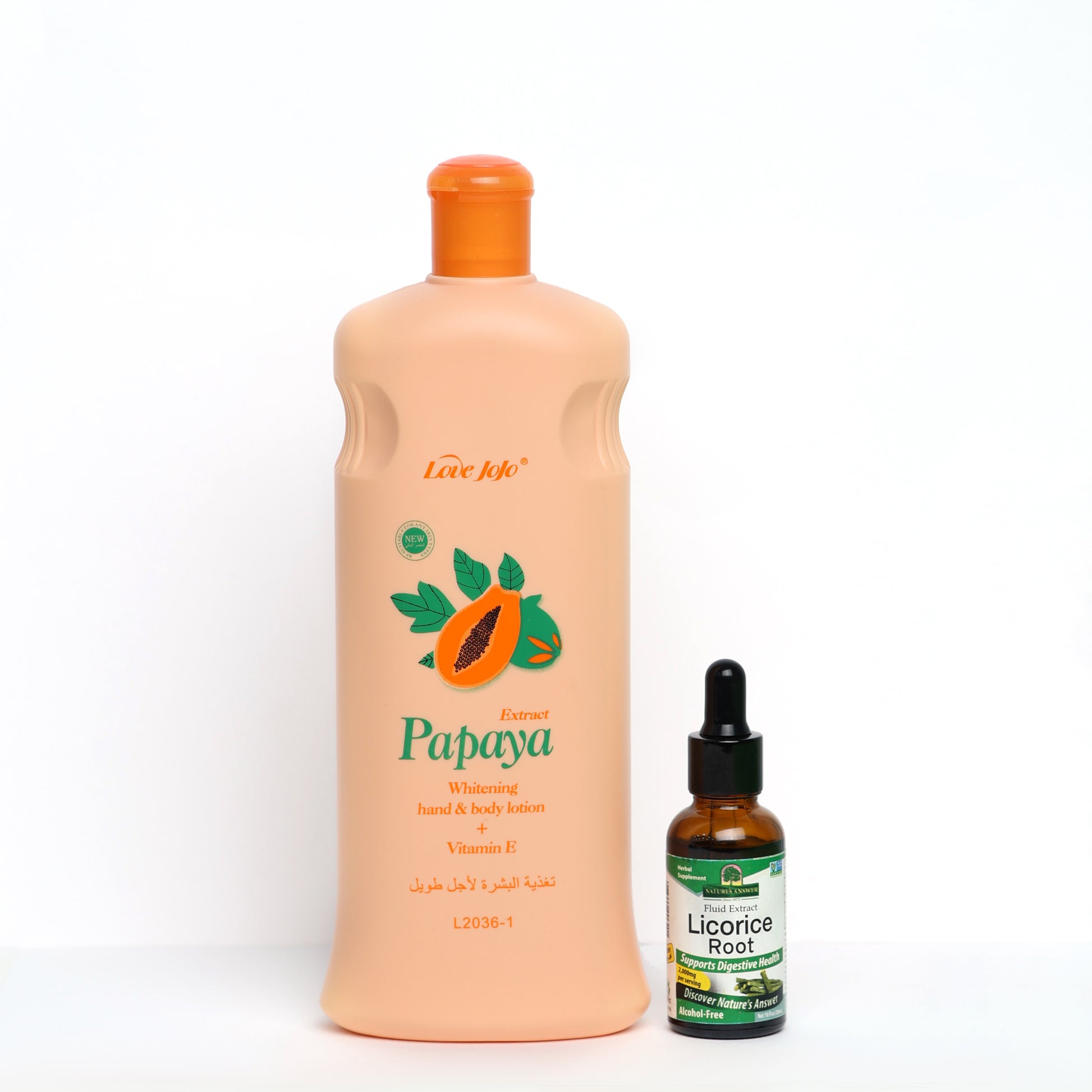 سيروم عرق السوس ولوشن بابايا بحجم عملاق(600مل) لترطيب البشرة،تنعيمها وتفتيحها كما تساعد على إزالة البقع الداكنة والتصبغات