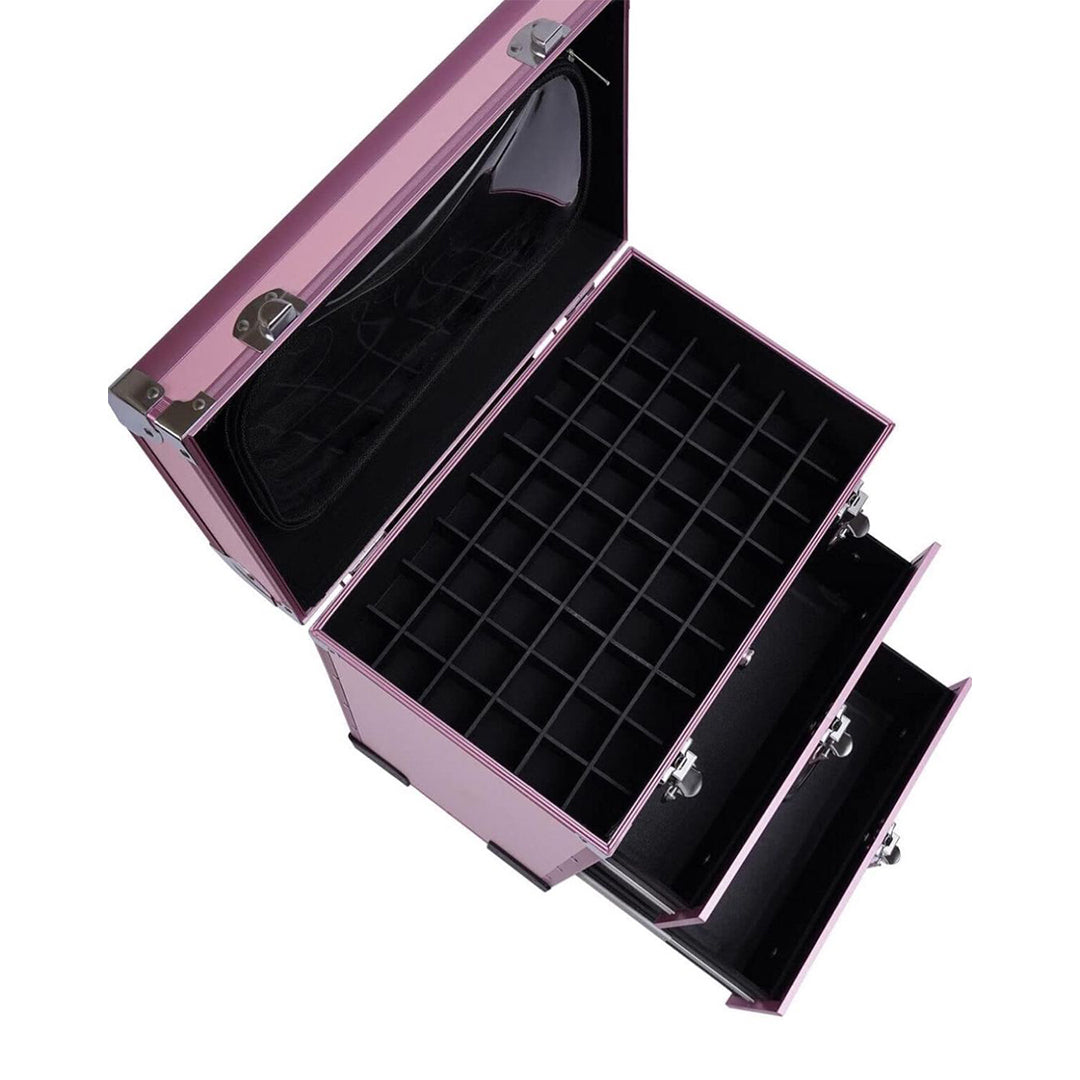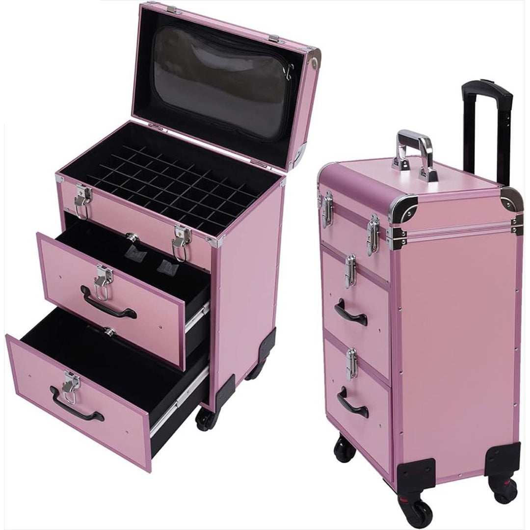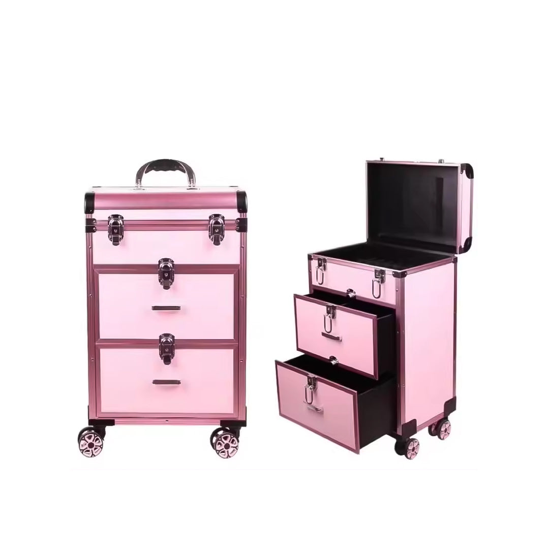 تحتوي حقيبة تخزين المكياج على 3 طبقات، يمكن للطبقة العلوية تخزين طلاء الأظافر أو أحمر الشفاه يمكن للدرجين السفليين تخزين مستحضرات التجميل وأجهزة التجميل الأخرى تمتاز بأنها سهلة التحريك والحمل بفضل العجلات