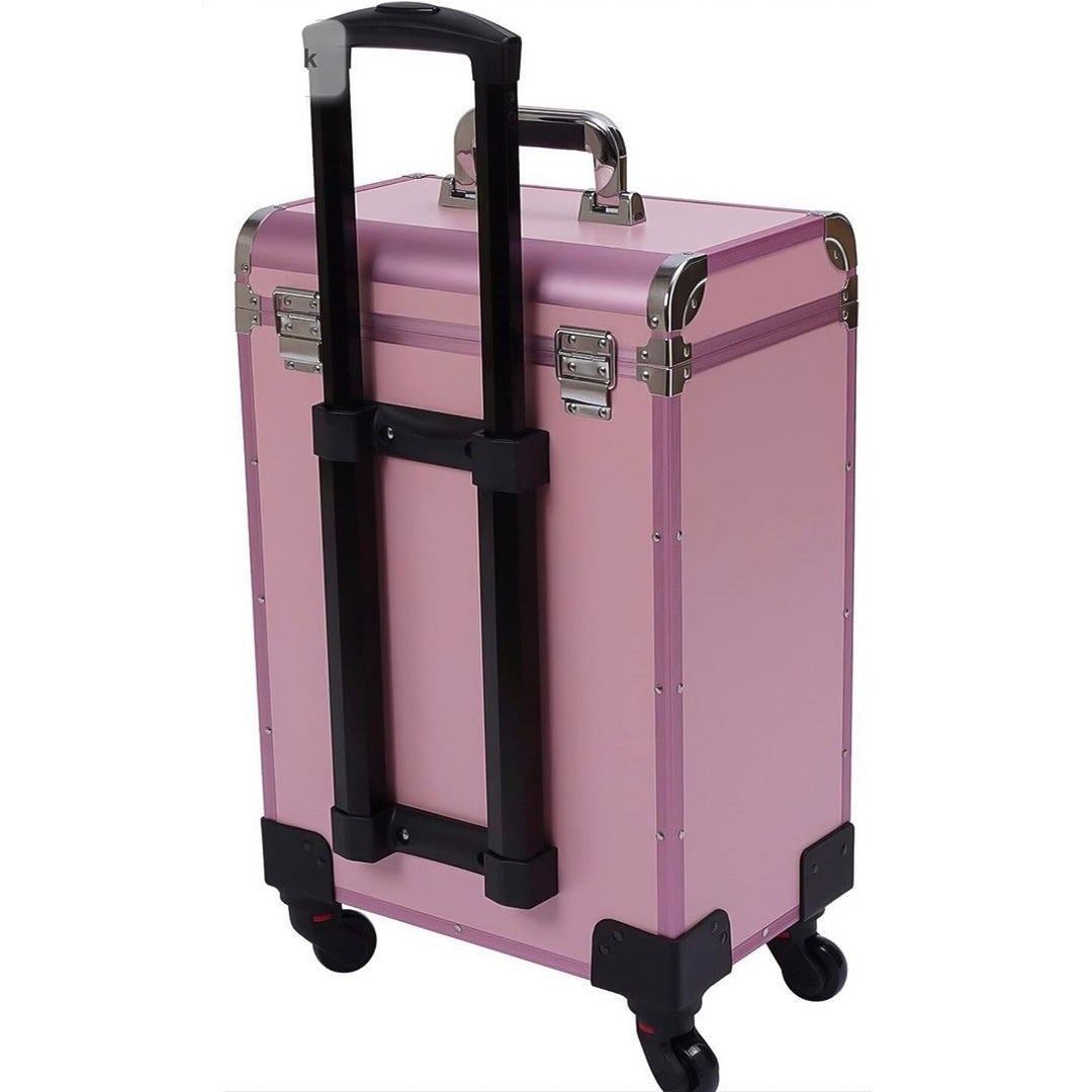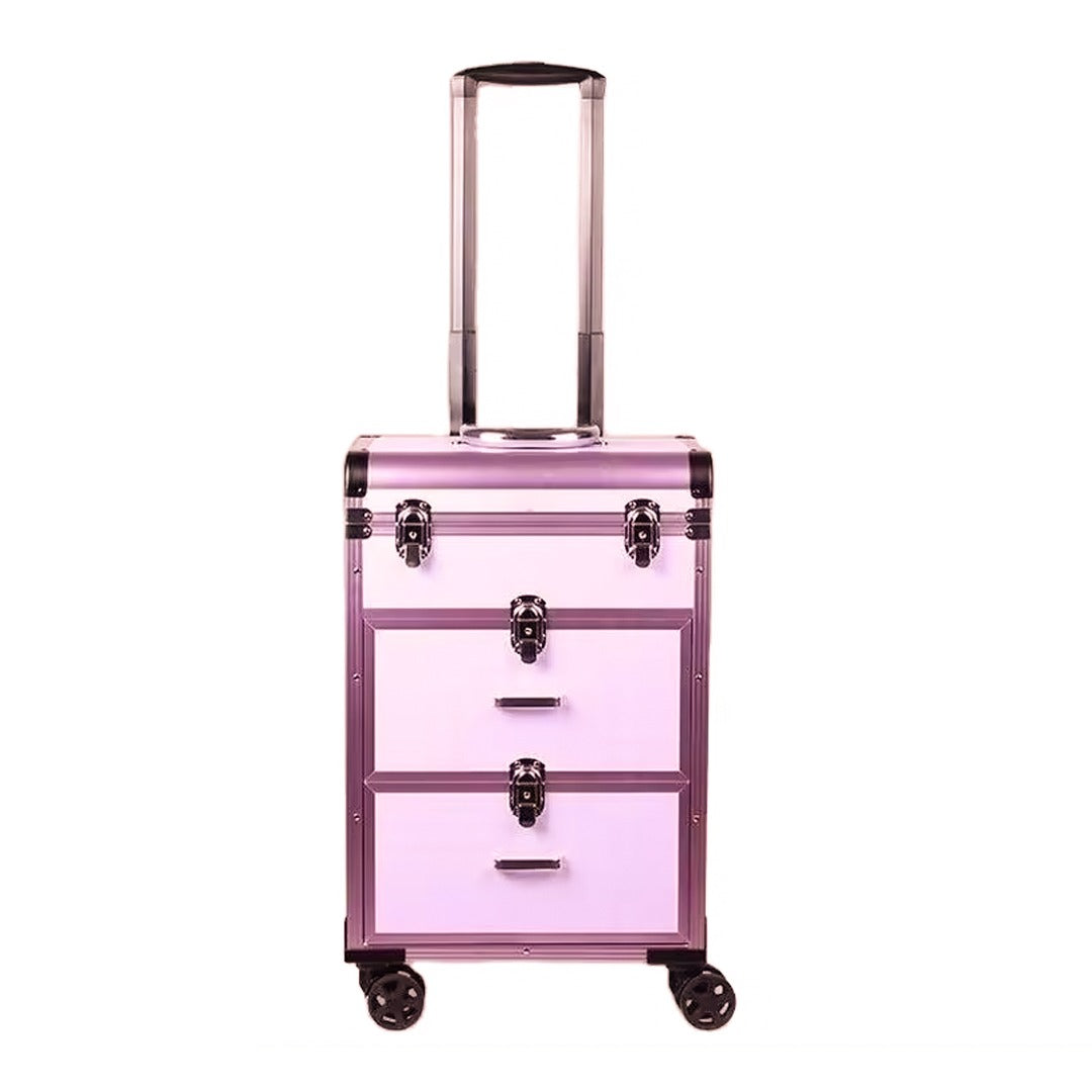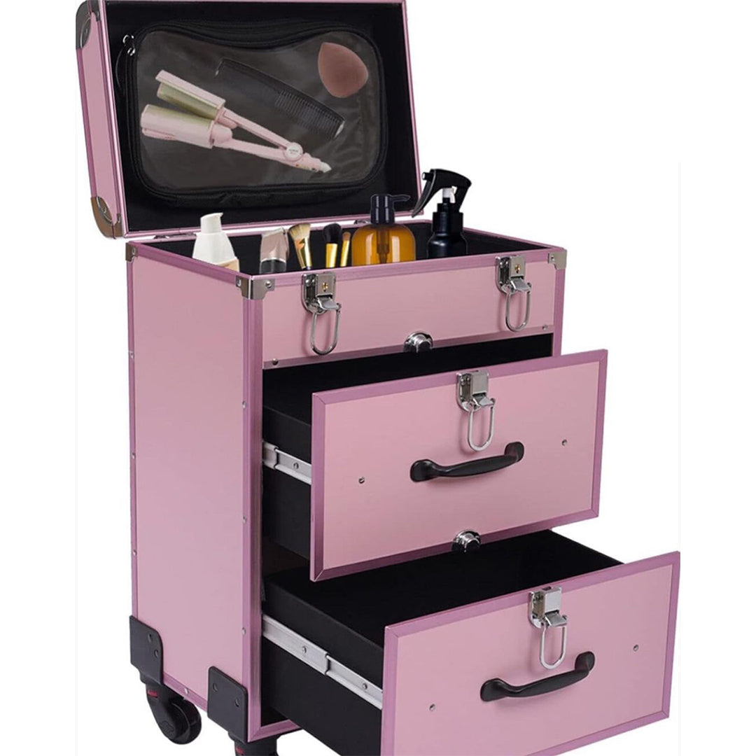 تحتوي حقيبة تخزين المكياج على 3 طبقات، يمكن للطبقة العلوية تخزين طلاء الأظافر أو أحمر الشفاه يمكن للدرجين السفليين تخزين مستحضرات التجميل وأجهزة التجميل الأخرى تمتاز بأنها سهلة التحريك والحمل بفضل العجلات